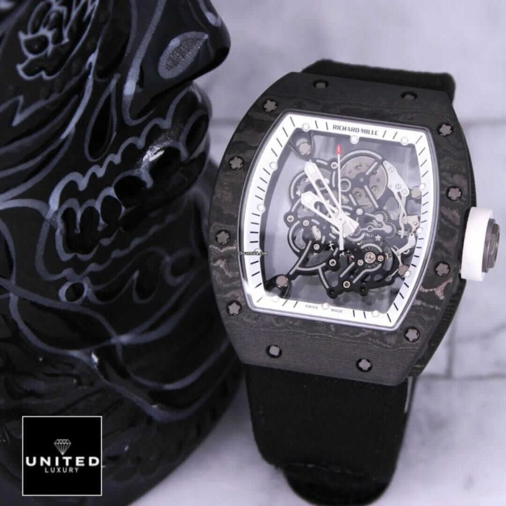 The Richard Mille RM055 White Legend Replica is a luxurious tourbillon watch with a sleek black NTPT Carbon Fiber case and bezel. It is powered by an automatic movement with a caliber of RM055 and a power reserve of 60 hours. The precision of the watch is within COSC certification limits, with a sweep motion second hand. The watch also features a black rubber bracelet with adjustable links and a 904L stainless steel deployant clasp. The skeleton dial has dot indices and 904L stainless steel stick hands. The watch is also water-resistant up to 30m and comes with a 2 year international warranty.